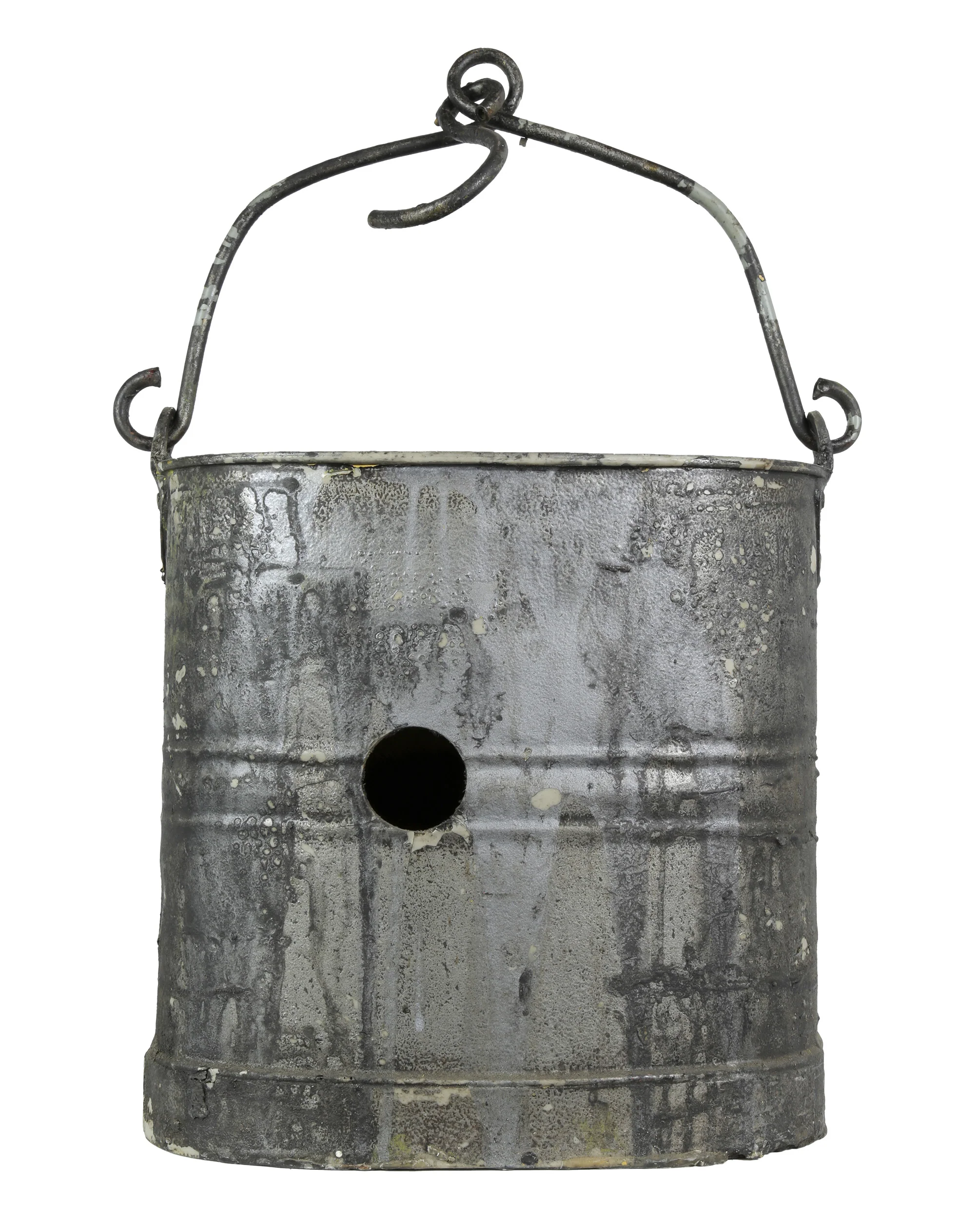Bucket is intentionally distressed appearing throughout. Top edge on one side has a crack.