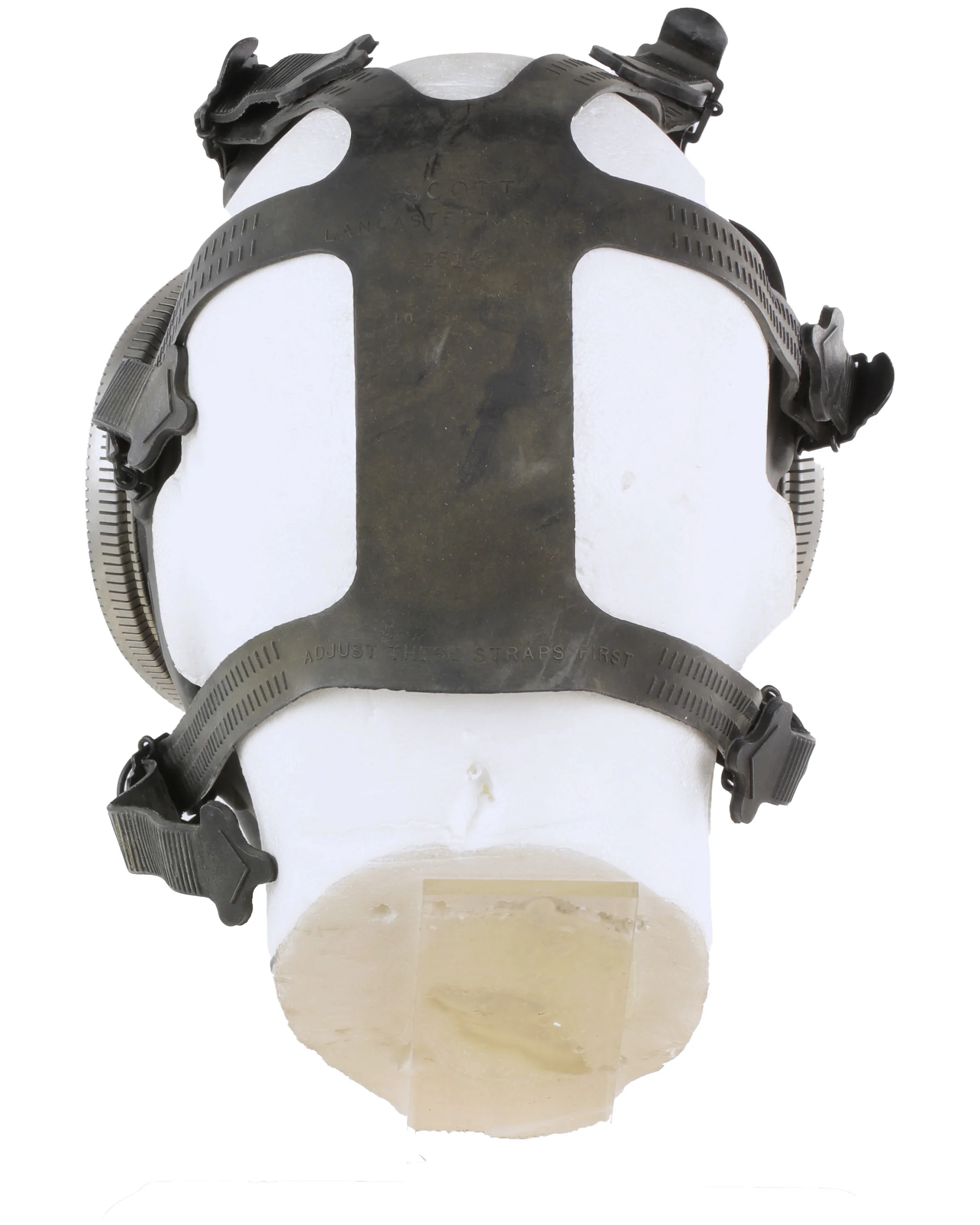 Obtained by the production for use in "Cliffhanger" (1993). Acquired directly from the film's production company, Carolco, this is a black aviation oxygen mask. Mask is made out of rubber and has clear plastic piece at obverse. Attached to lower obverse is a ribbed tube. Engraved text at top center edge of metal trim around plastic reads “S/N 4340”.