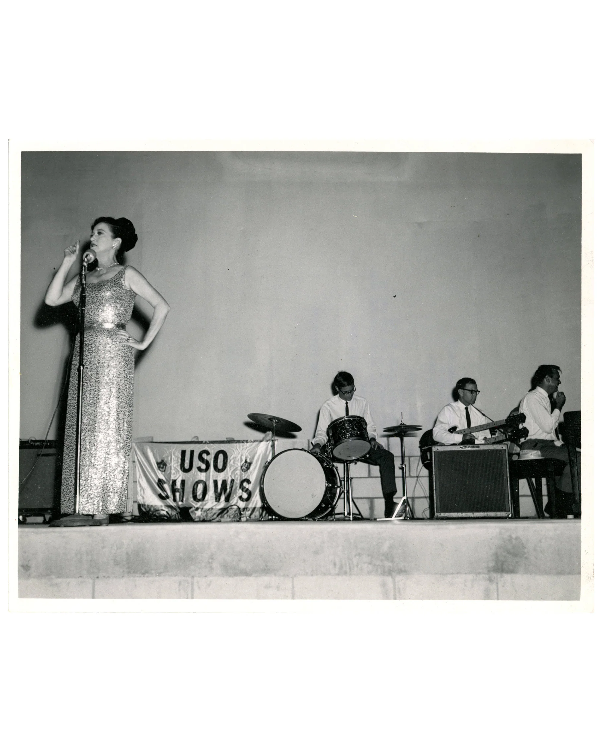 Collection of seven (7) photographs from Dorothy Lamour's visit to the U.S. Naval Base in Guantanamo Bay, Cuba, in May 1966, where she performed at a USO Show. Photographs are official U.S. Navy photographs with official information stamps on reverse.