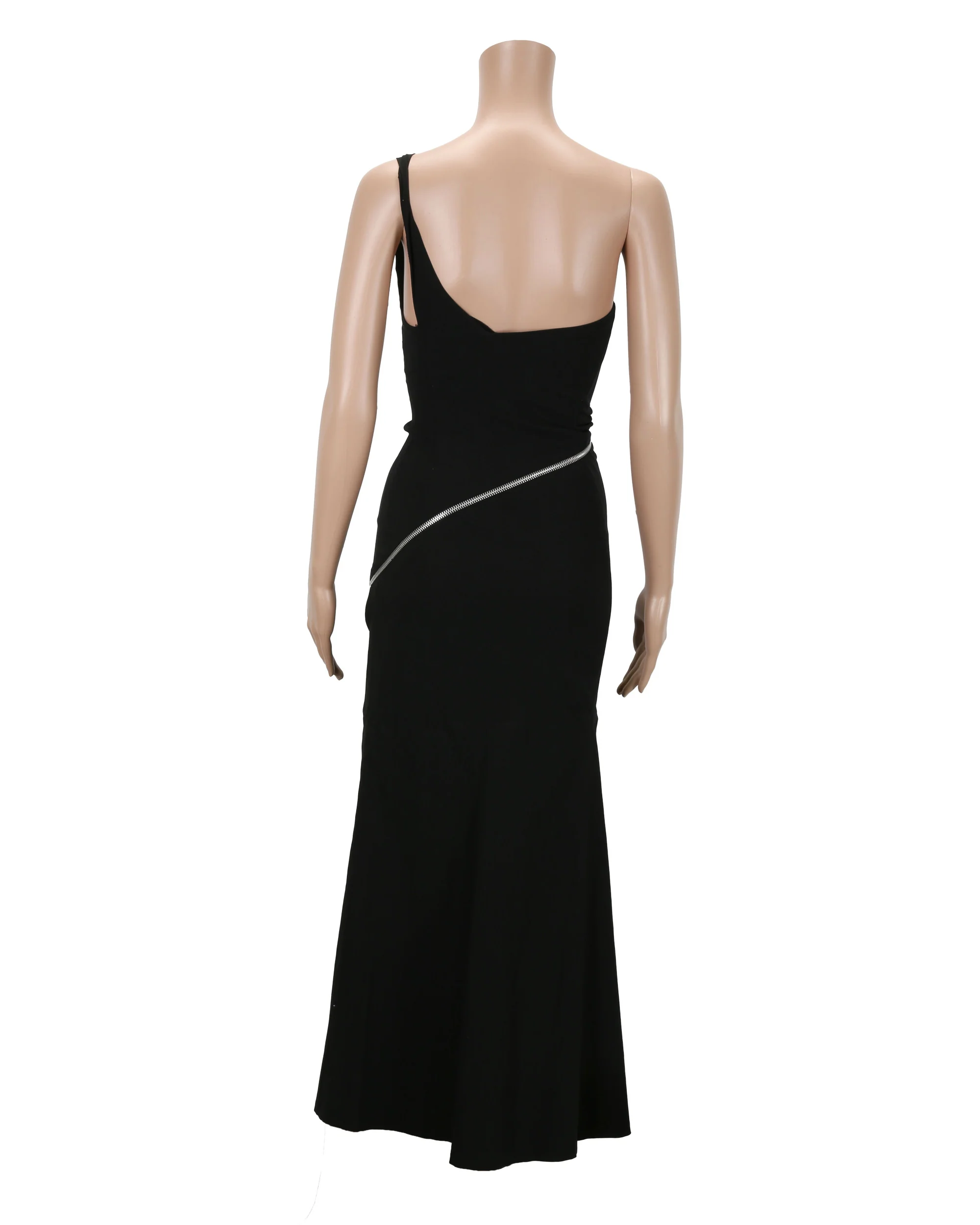 Dress created by the production for use in the French film "Everything Must Go (Tout doit disparaître)" (1997) for Ophélie Winter's character "Eve Latour." Black one-shouldered dress with zipper that begins at shoulder and crosses in front of body, ending at proper left thigh.