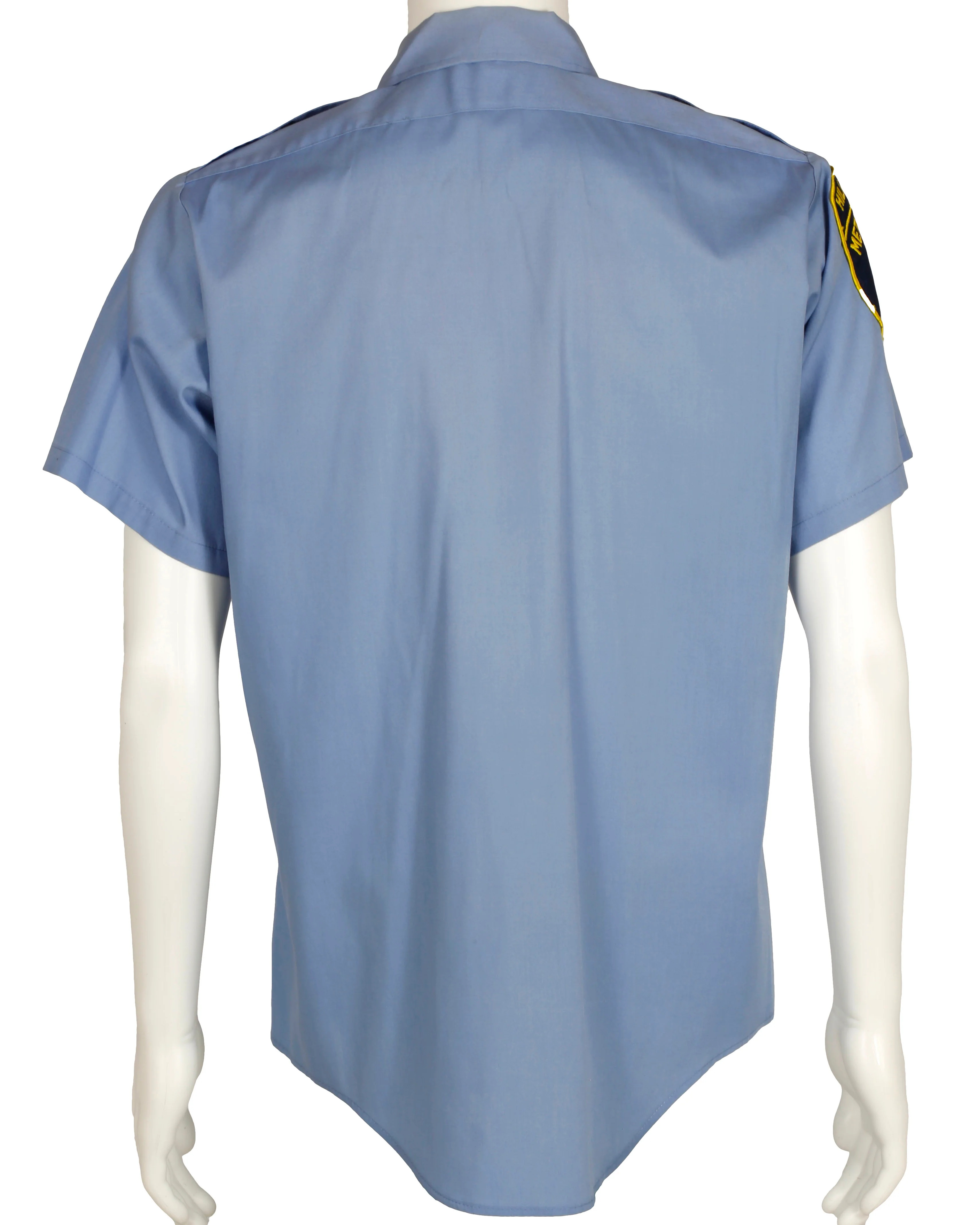 The police uniform shirt was acquired by the production for use in "Hill Street Blues (1981-1987) for Michael Warren's character "Officer Bobby Hill". Light blue men's short sleeved polyester uniform shirt with button down front, double breasted pockets with button closures, epaulet on each shoulder, and patch on proper right sleeve. Patch is a shield shape with navy blue background and yellow embroidery throughout that reads "HILL ST. PCT. / METROPOLITAN / [torch] / POLICE". Cuff of each sleeve has three button closures. Above proper left breast pocket is a piece of material with two eyelets intended for a badge to be attached. White tag on interior of center seam near bottom on proper right panel with handwritten text reads “HILL".