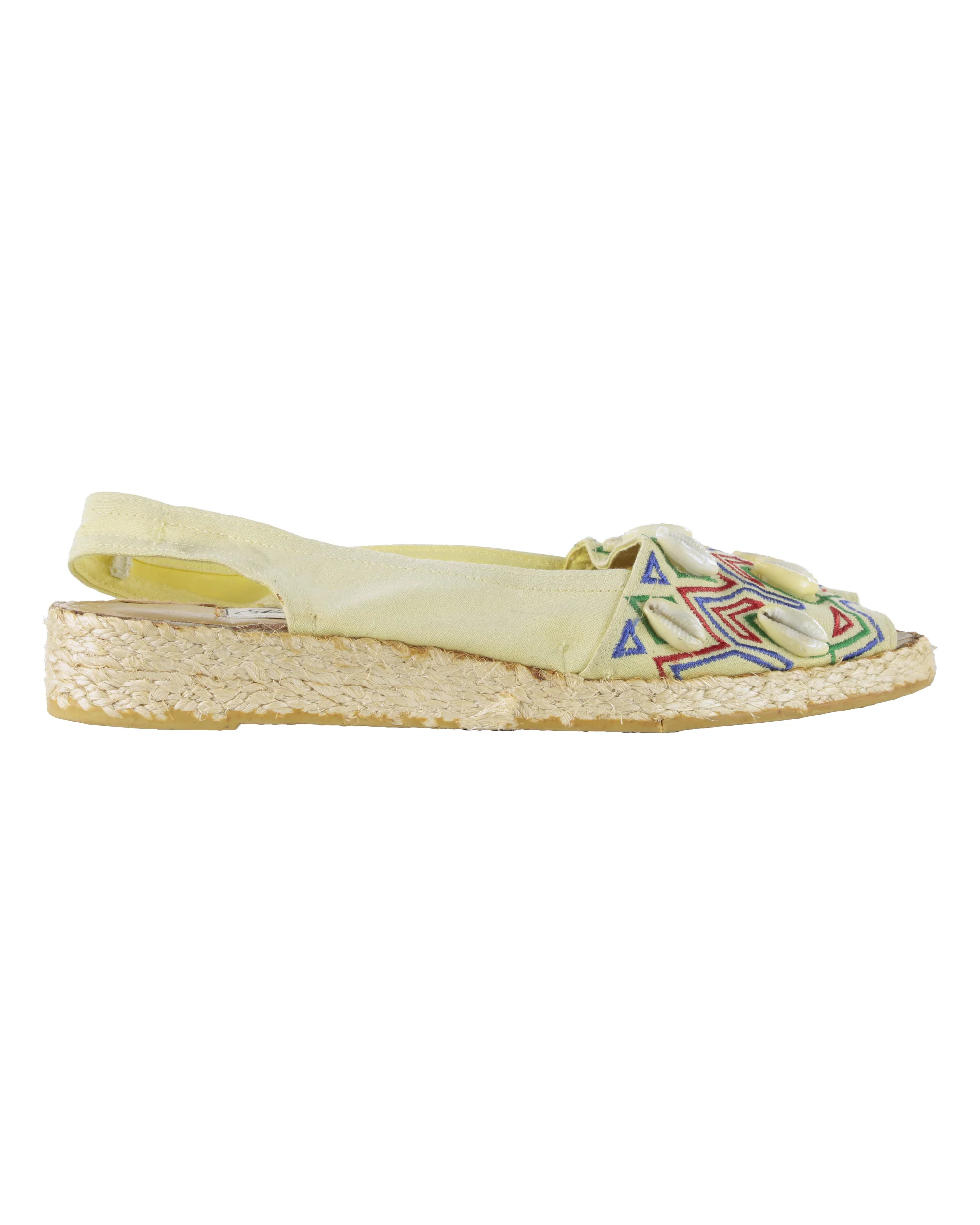 Acquired by the production for use in "Honeymoon in Vegas" (1992) for Sarah Jessica Parker's character "Betsy Nolan." This is a pair of sling back sandals with yellow canvas on top. Canvas has red, green and blue geometric designs throughout top near the front of each shoe. The areas over the toes have two rows of cowry shells. Sides of outsoles and heels are covered with a natural braided sisal. Saks Fifth Avenue brand.