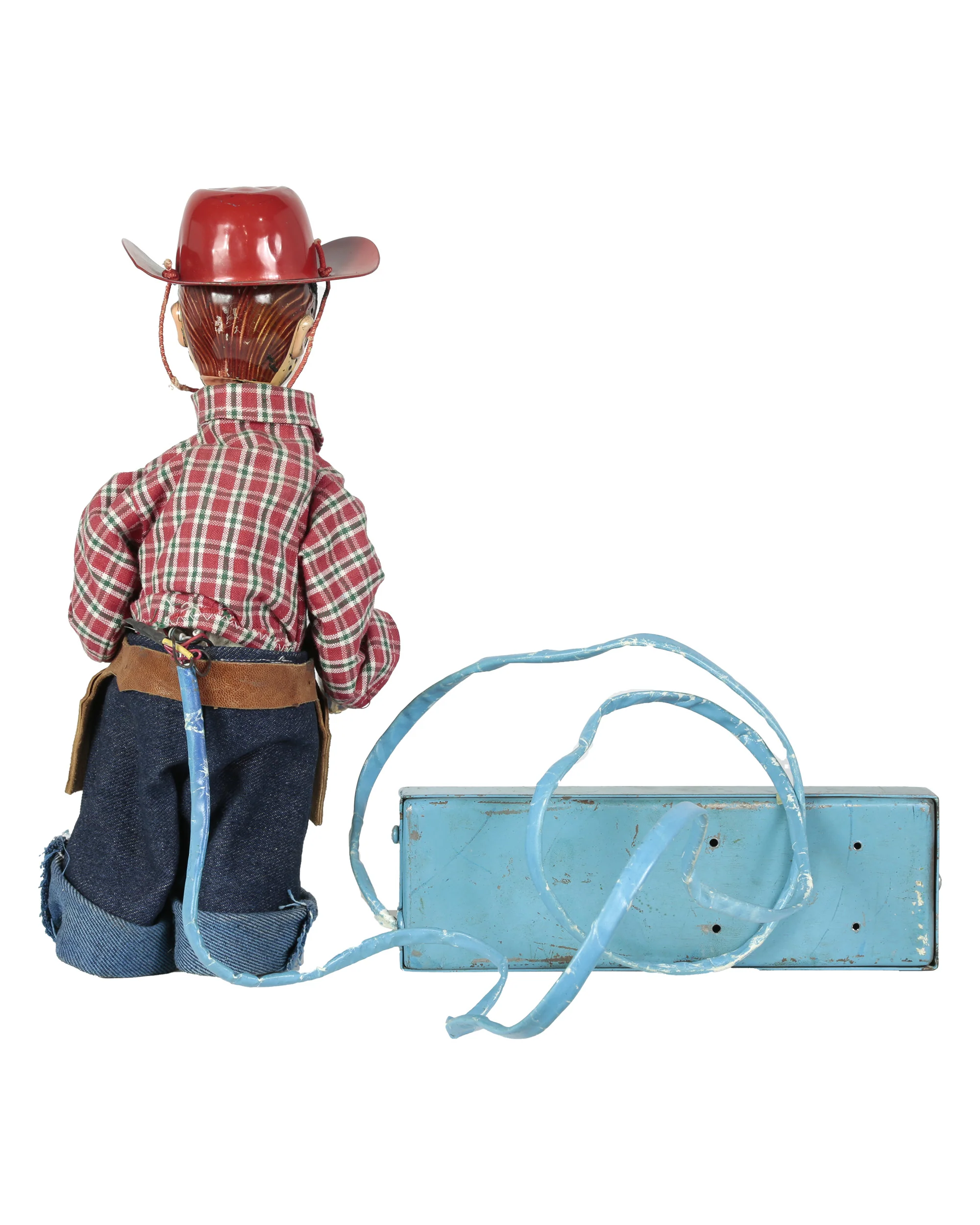Prop remote controlled toy obtained by the production for use in "House Arrest" (1996). Remote controlled “Wild Bill” cowboy. Figure is constructed out of metal and plastic and is painted a flesh tone throughout with brown hair, blue eyes, and freckles. Figure is wearing a red metal cowboy hat, and plaid button up shirt, and jeans with a brown belt. He is holding a red plastic gun in each hand. Attached at the reverse of the figure is a blue metal controller with a red light, two red buttons, and a silver switch.