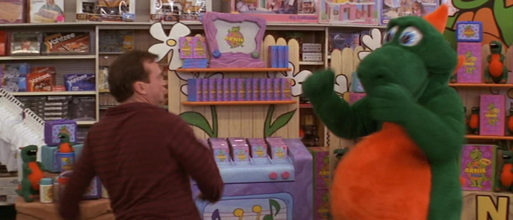 Prop "The Arnie Video" created for the production of "Nine Months" (1995). Video cassette box for “The Arnie Video”. Obverse of box has image of Arnie the Dinosaur standing against a purple polka dotted background. Text throughout that reads “HEY KIDS / IT’S HERE” and “THE / ARNIE / VIDEO”. Orange sales sticker notes that the sales price was $24.95 dollars. Text on both sides of box reads “THE ARNIE VIDEO”. Reverse side has image of Arnie with two children and a list of seven songs. Note: Does not contain VHS cassette.