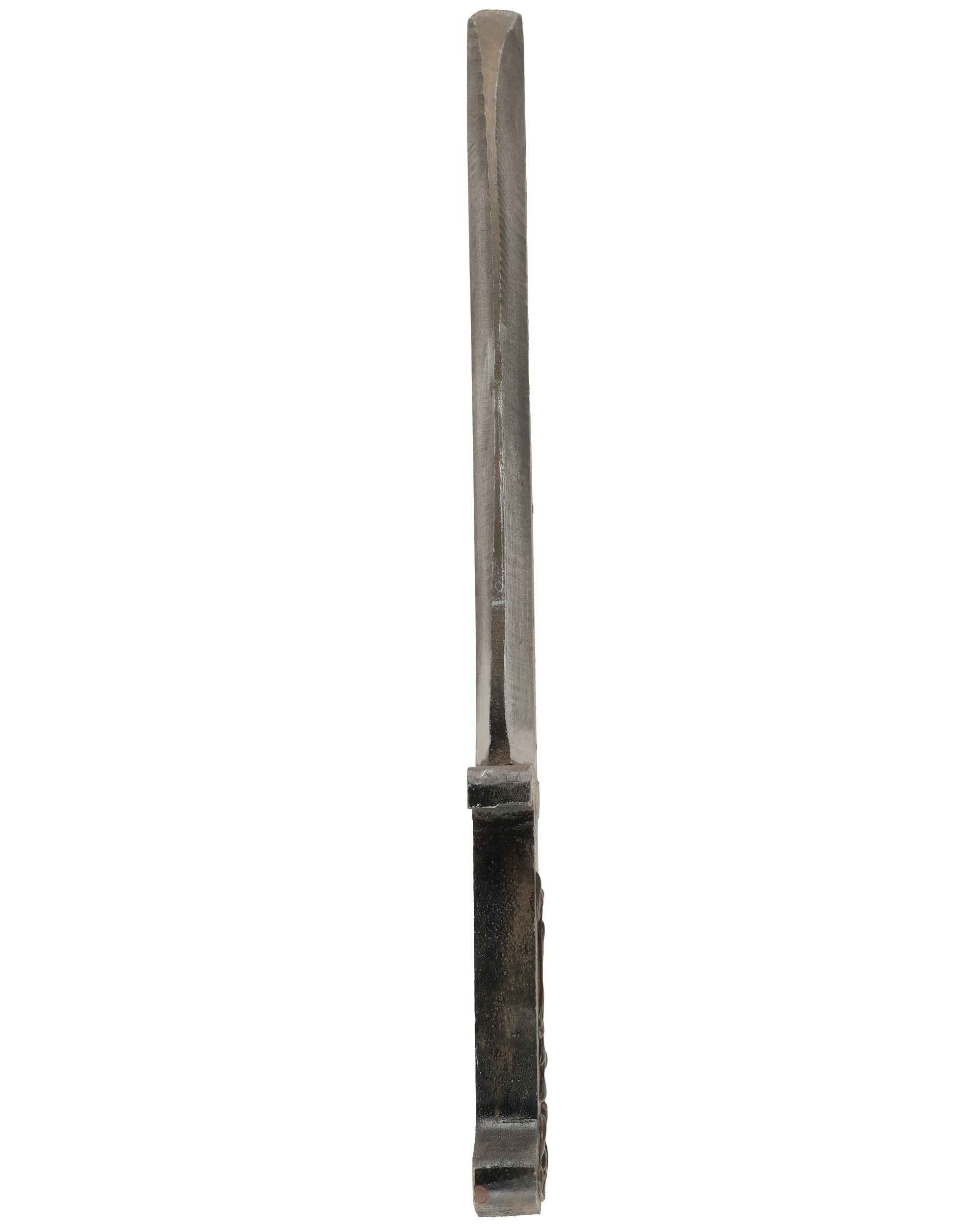 Created for the production of "Northern Exposure" (1990-1995) for Barry Corbin's character "Maurice J. Minnifield", this prop wooden knife has a large, thick blade painted silver and black. The hilt is painted brown, with an S-shape guard and abstract designs thickly painted on one side handle.Â