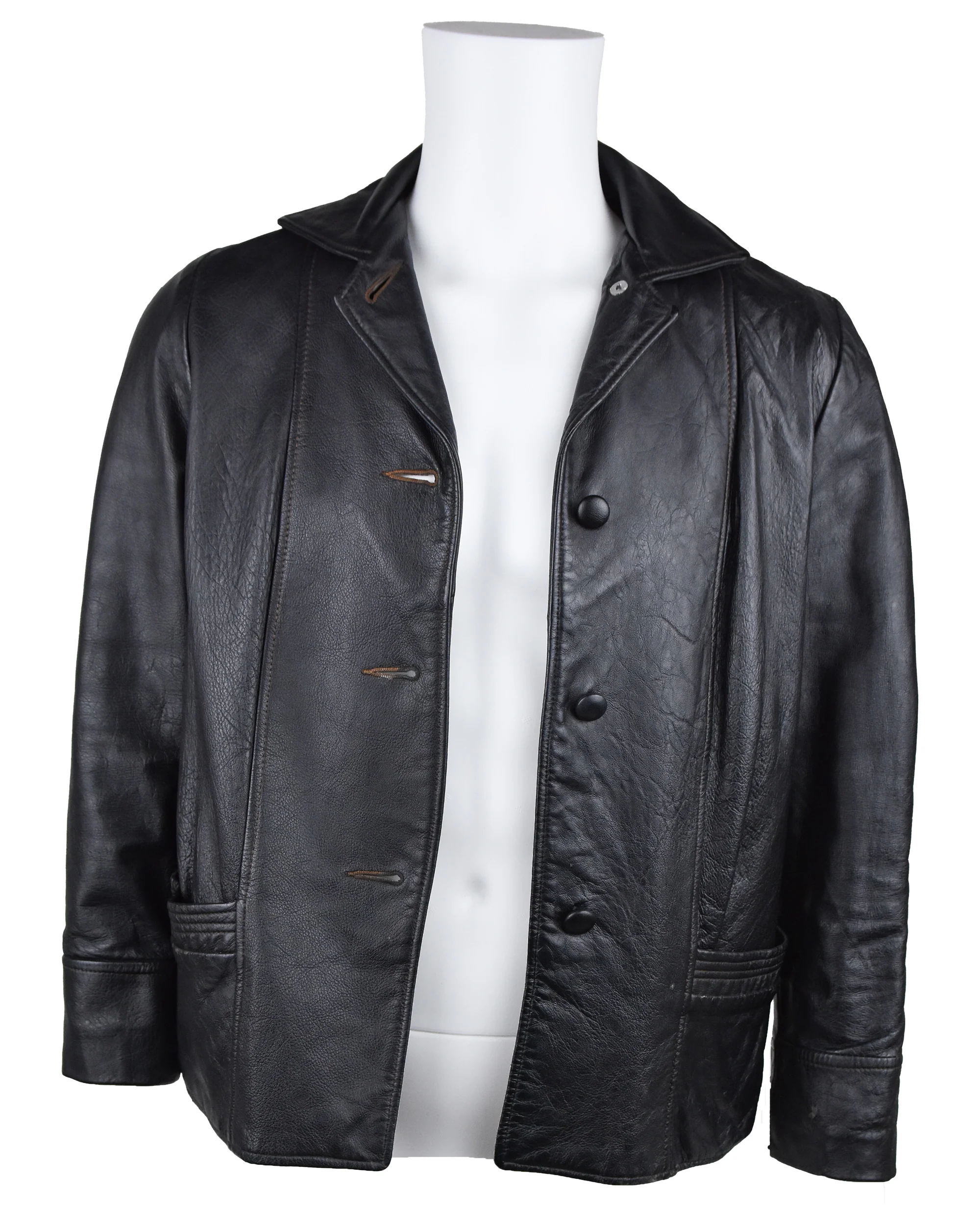 Jacket: Black leather jacket with pockets at either side of obverse waist. Black buttons at obverse closure. Interior lined in patterned black satin. Mismatched buttons on interior of closure.