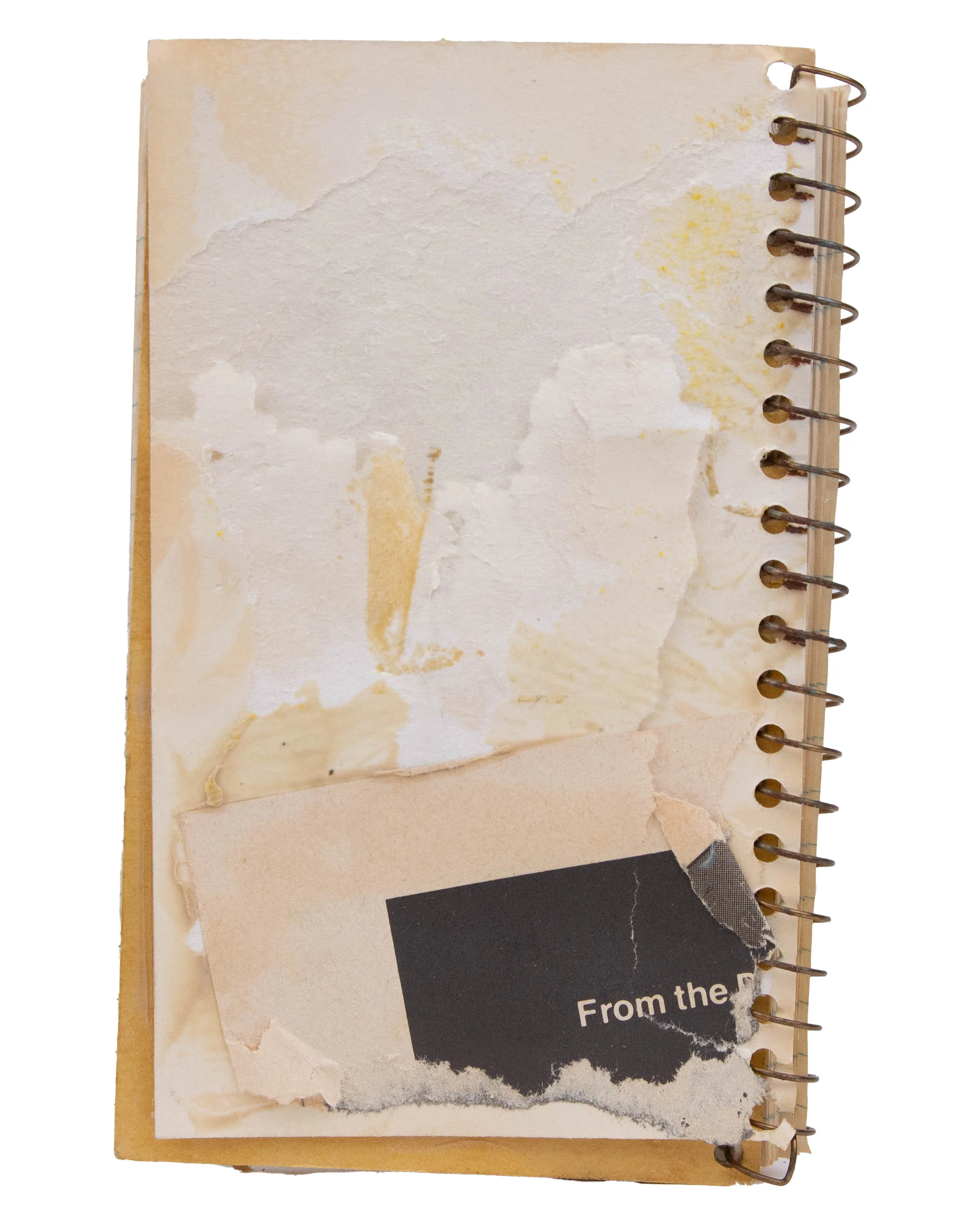 Notebook:Â Front and back covers have been taped together. Top and bottom proper left corners on open page are bent. Two small brown stains near center of open page. Double sided tape residue on back of open page.