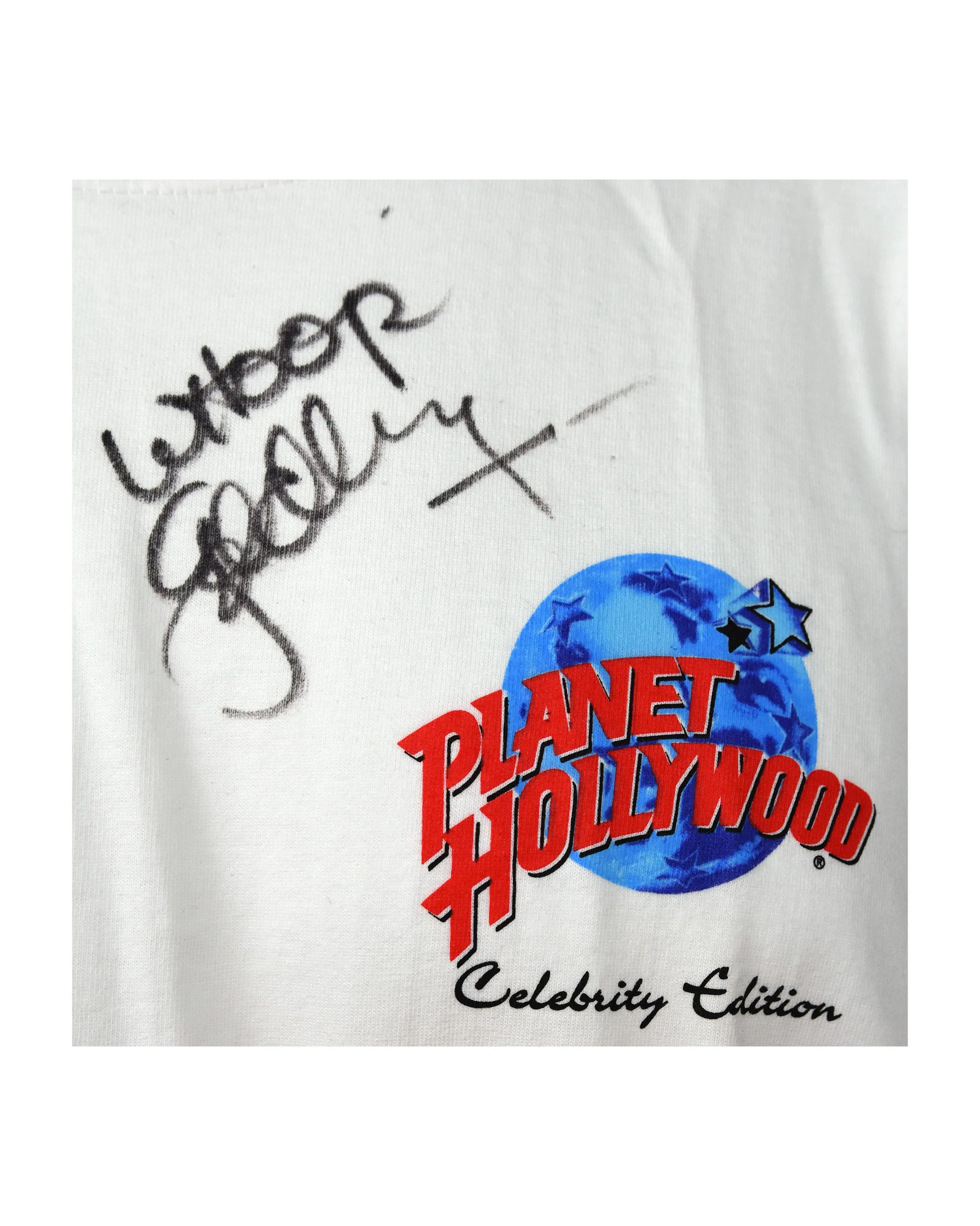 White "Planet Hollywood" T-Shirt autographed by Whoopi Goldberg. Front proper right near top has a "Planet Hollywood" logo with cursive text below it which reads "Celebrity Edition." Whoopi Goldberg's autograph is written in black marker above the logo. The reverse of the shirt has a black and white caricature of Goldberg at the center with stars for eyes. "Whoopi Goldberg" is printed in cursive in red text running vertically to the right of the caricature. Shirt size is -X-Large. Tag in the reverse interior collar states this shirt was made specially for Planet Hollywood, with wash and care information on the reverse of the tag.