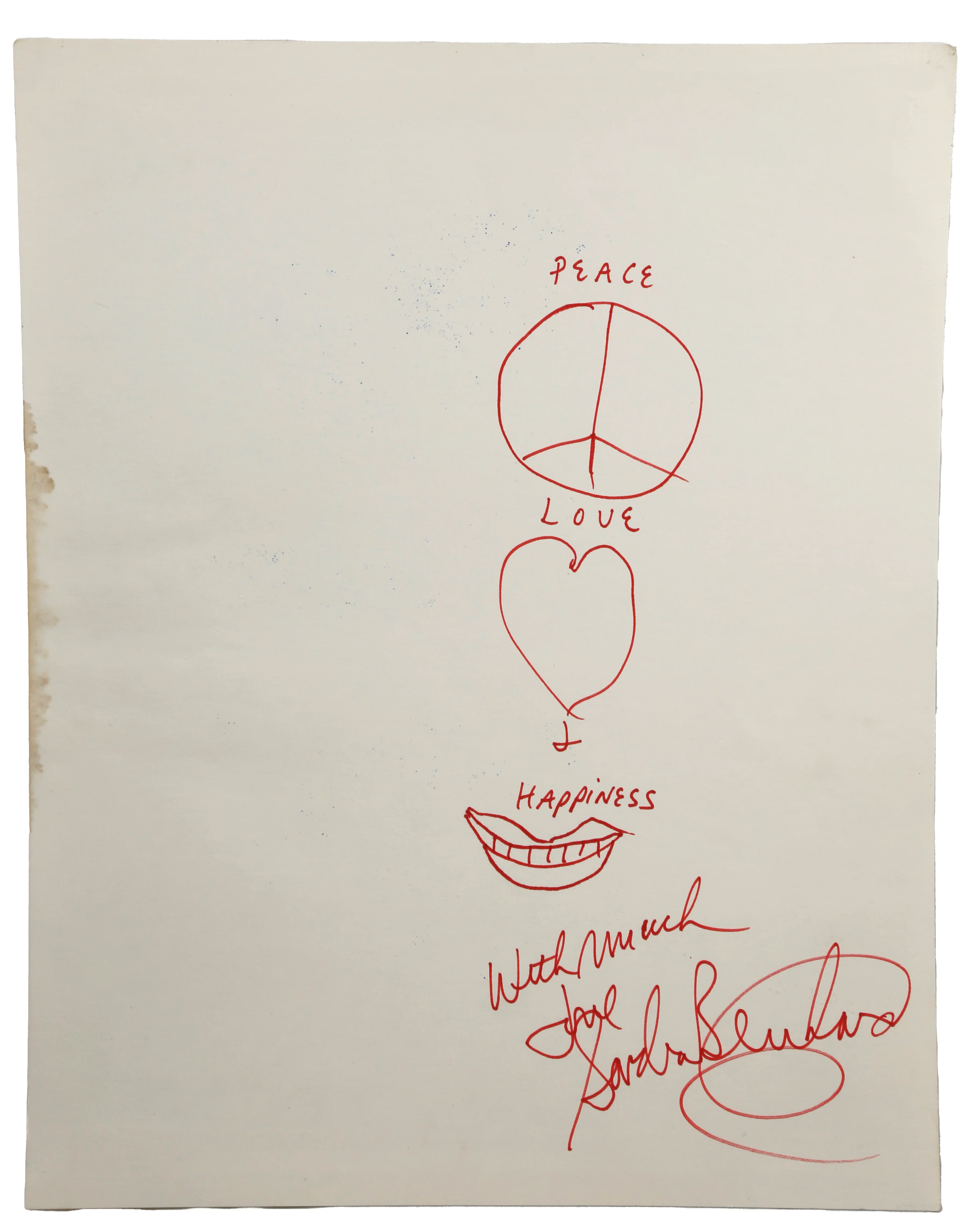 Sandra Bernhard sketch - Red ink sketch reads "PEACE / LOVE / HAPPINESS" with a sketch of a peace sign, a heart, and a smiling mouth beneath each respective word. Bottom proper left corner reads "With much / Love / Sandra Bernhard" in script.