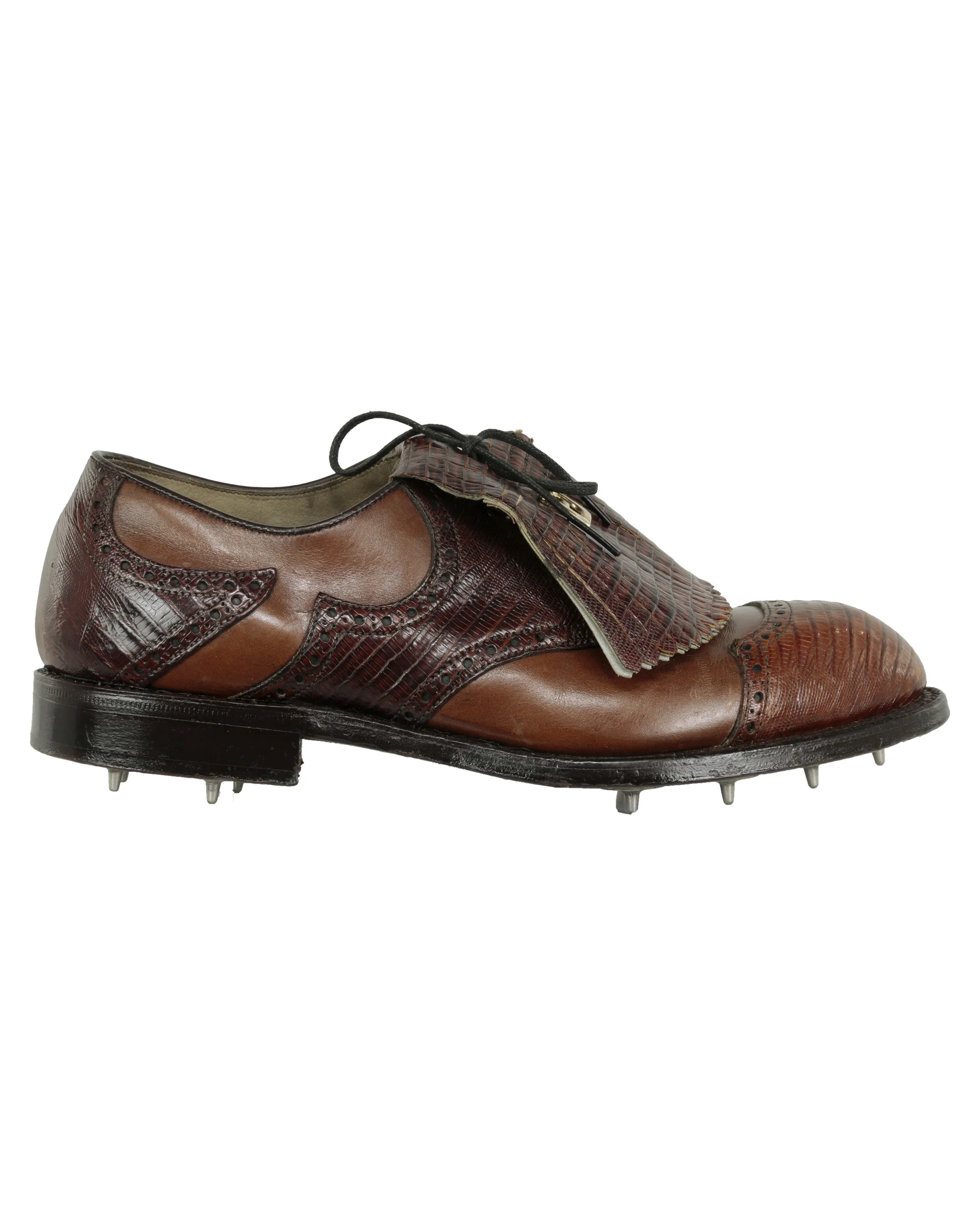 Shoes: Pair of brown alligator skin golf shoes with lace cover and gold-toned “FJ” decoration on cover.  FootJoy brand.