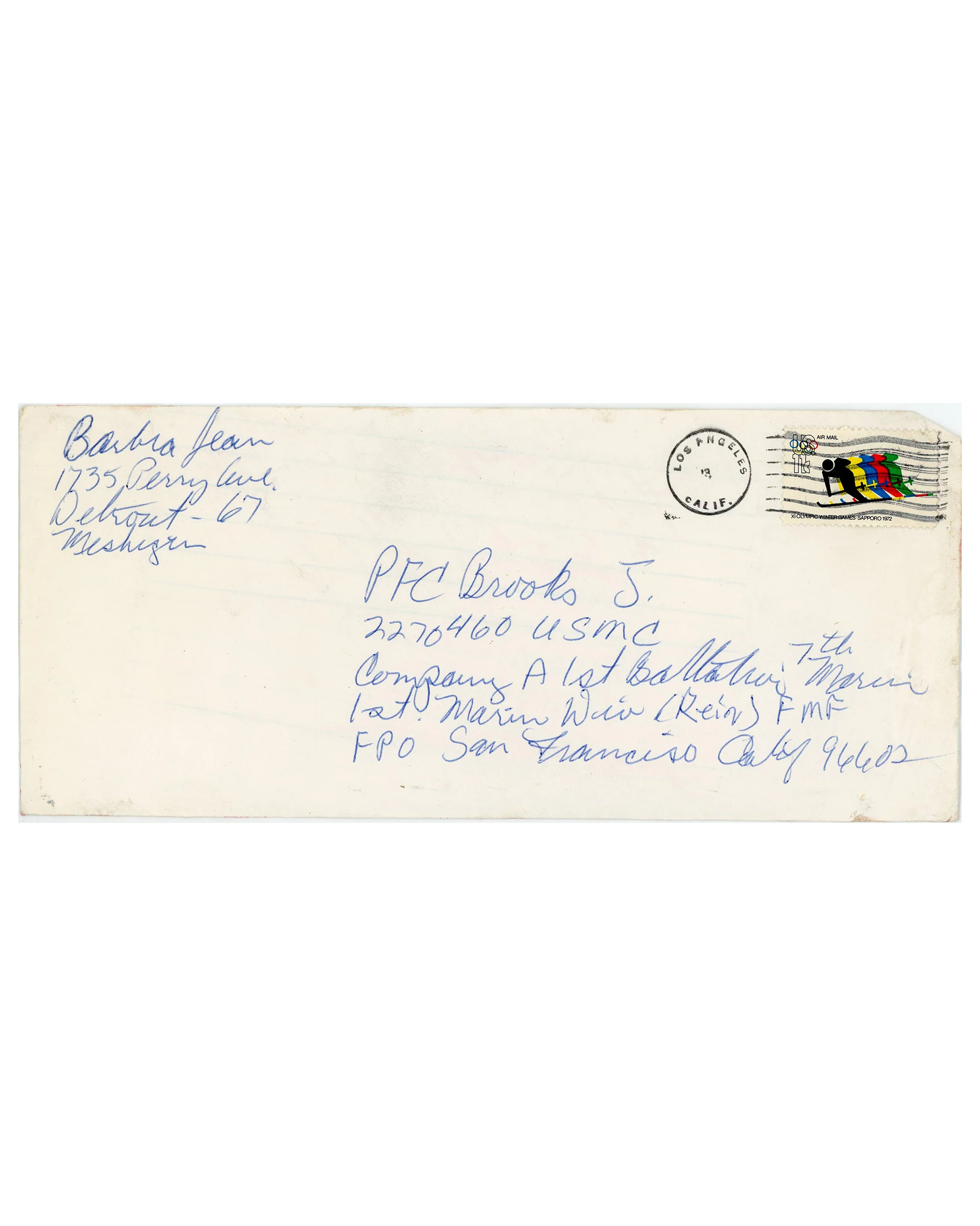Letter to Brooks: Prop letter consists of a sealed envelope that contains a handwritten letter. Stamp with illustrated skiers from the 1972 Sapporo Winter Olympics is on the obverse top proper left corner. Handwritten cursive text on the obverse top proper right corner reads “Barbra Jean / 1735 Perry Ave. / Detroit - 67 / Michigan.” Handwritten text on the obverse center reads “PFC Brooks J. / 2270460 USMC / Company A 1st Battalion 7th [illegible] / 1st Marine [illegible]: (Rein) FMF / FPO San Francisco.”