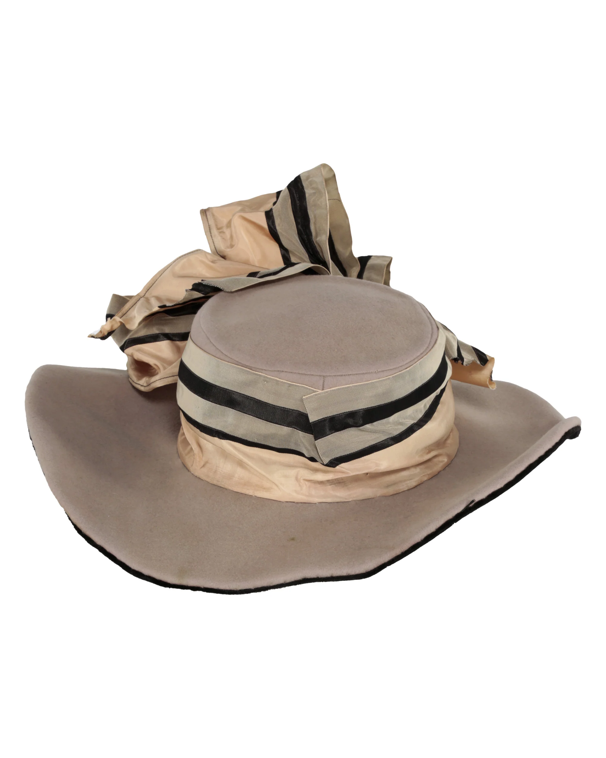 Ribbon has creases throughout. Brim of hat is slightly misshapen.