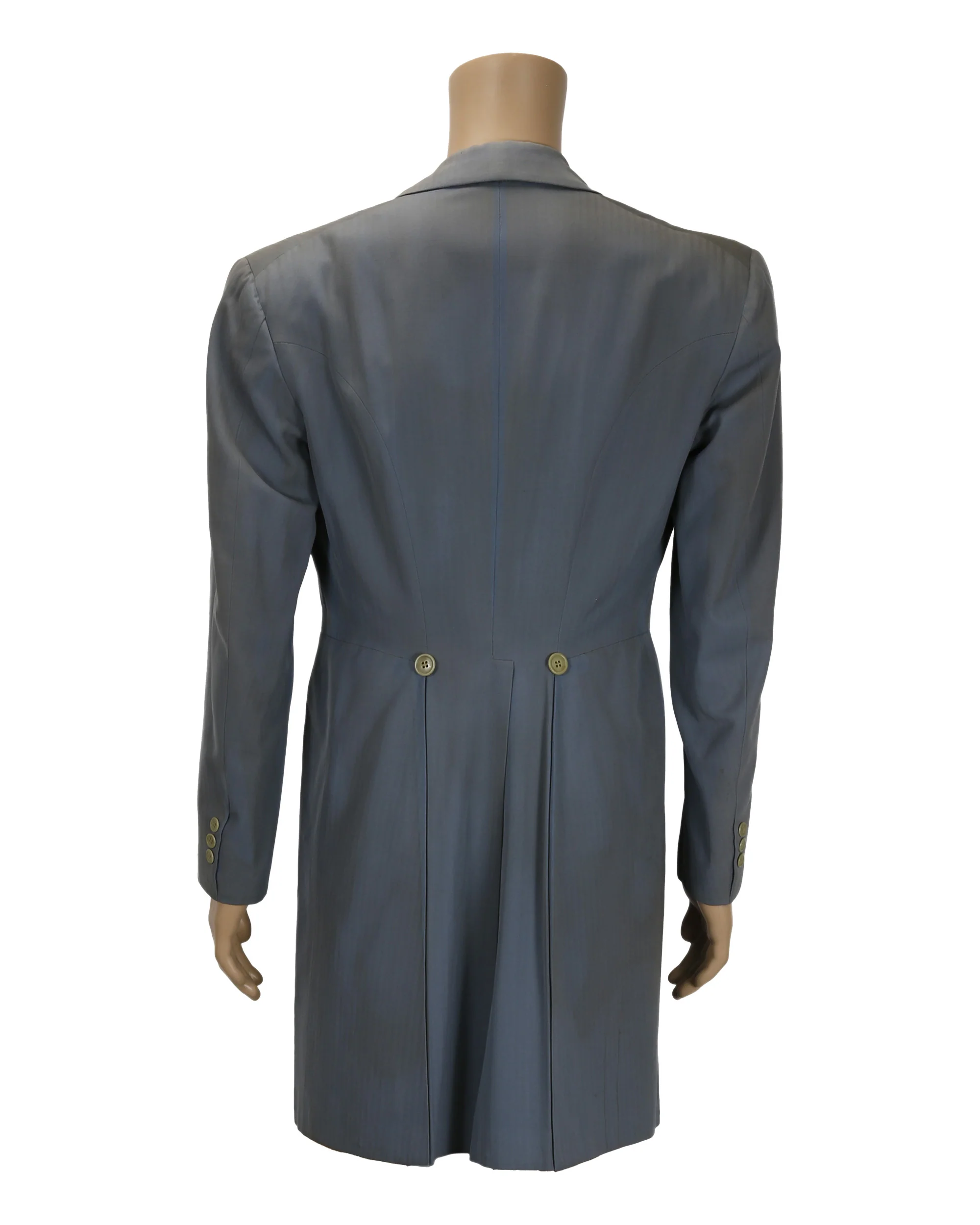 Blue coat from an unknown production. Circa 1940s. Blue period style coat with notched lapels and three round buttons on proper right lapel. Coat has two buttons on reverse side of jacket along with two slits.